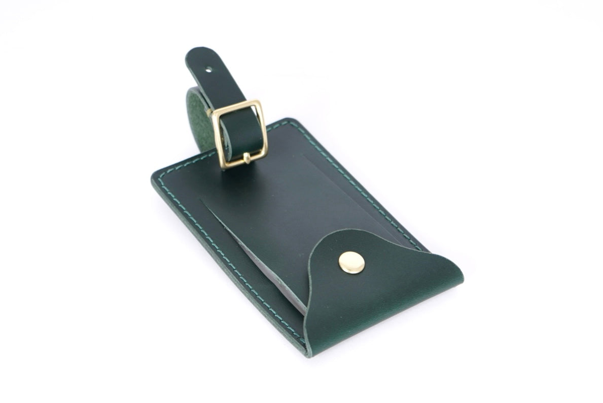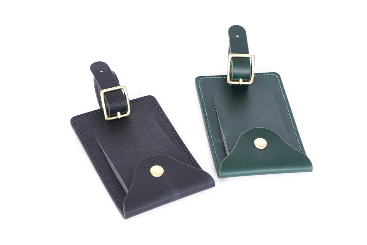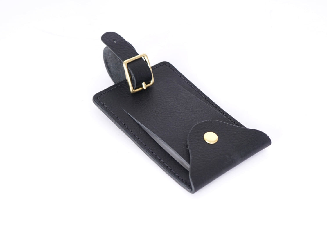 A handmade luggage tag to add some flair to your suitcase or carry on. Use the included card to write your info or slide in a business card which can be easily seen when you open the flap.