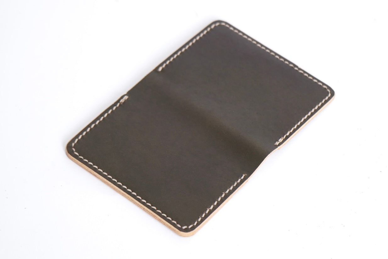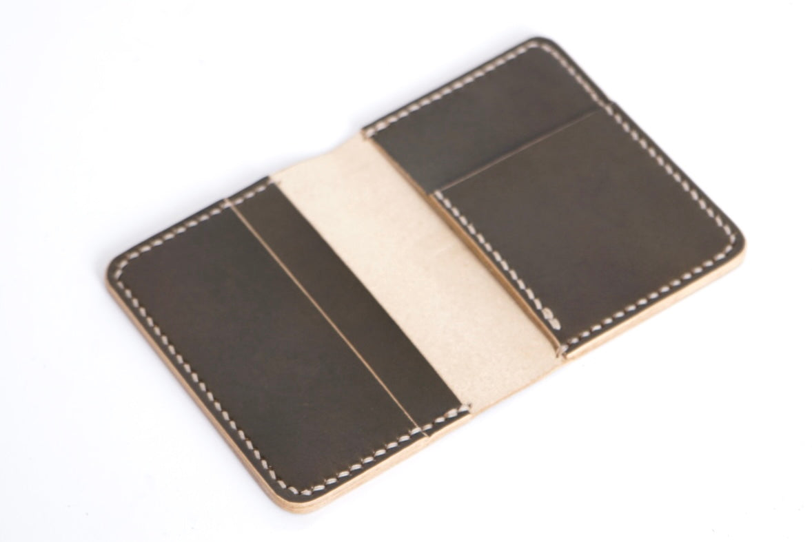 The Page Wallet uses a 3-4oz full grain vegetable tanned leather. Vegetable tanned leather is a chemical-free tanning process that uses natural tannins from wood, bark and leaves. The matte finish on this leather will patina over time and develop a shine the more it's used.